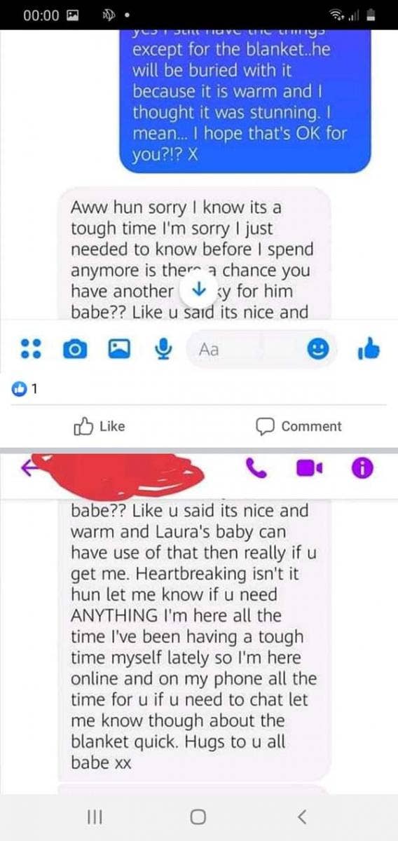 “I just needed to know before I spend anymore, is there a chance you have another blanky for him babe?…Like you said its nice and warm and Laura’s baby can have use of that,” the friend responded. “Heartbreaking isn’t it hun let me know if u need ANYTHING I’m here all the time.”